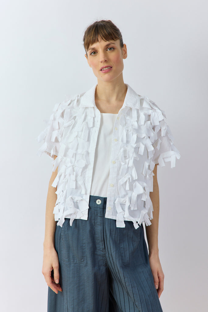 A statement overshirt cut to a neat size and crafted from cotton lawn, lavishly adorned all over with a plumage of raw-edged ribbons, each cut on the bias to stop fraying. The shirt body is based on a polo-shirt profile, which achieves an eye-catching look while creating a playful sense of casualness. Colour is applied using a garment-dye process, in which fully constructed garments are dyed to create a softer hand feel.
