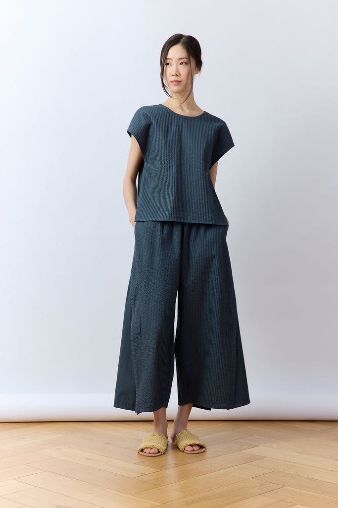 Expertly pattern-cut so the flare of the pintuck sections falls beautifully, creating fluid volume and an elegant, dynamic drape with every step. Finished with inseam side pockets. Fully elasticated waistband, constructed on the wider side for a super comfortable fit.