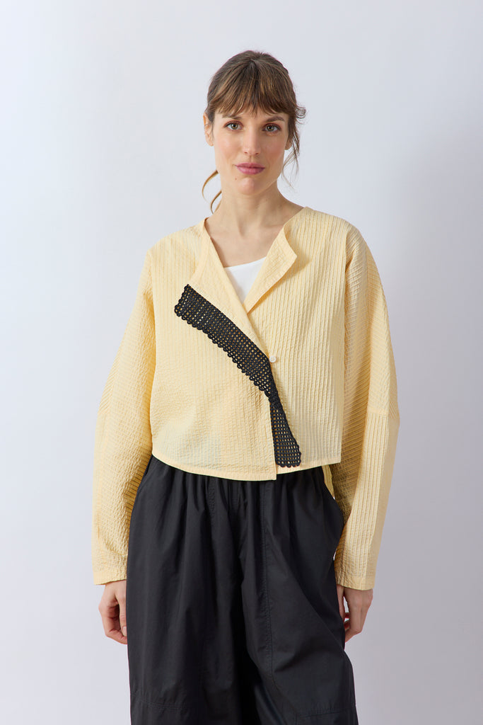 This refined collarless jacket, cut from cotton lawn, is created by carefully stitching cotton cord onto a water-soluble sheet. Once washed in the garment-dye process, the soluble sheet disappears, leaving a striking mesh motif.