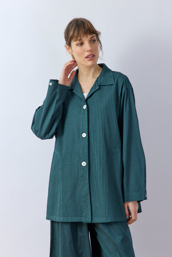Cut from calico, a slightly heavier cotton than lawn, the Kyarako overshirt features pintuck work and jacket elements. Designed for a relaxed width and length that comfortably covers the waist and hips. Special attention is made to the cuffs, which are adjustable with buttons for a customisable fit.